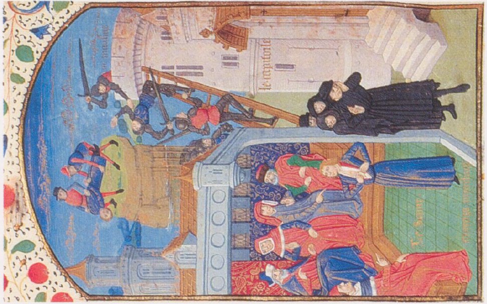 Londra, British Library, Add. 18750, f. 89v. Marco Manlio Capitolino mostra al Senato le ferite ricevute in battaglia; Manlio difende la collina del Campidoglio (raffigurata come una torre) dall'assedio dei Galli; sullo sfondo, Manlio viene gettato dalla rupe Tarpea.