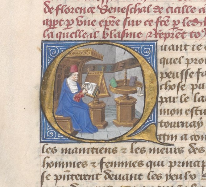 Londra, British Library, Add. 35321, f. 1v. L'autore Giovanni Boccaccio siede dinanzi ad un leggio nel proprio studio, intento a scrivere un libro, all'interno dell'iniziale figurata Q(uant).
