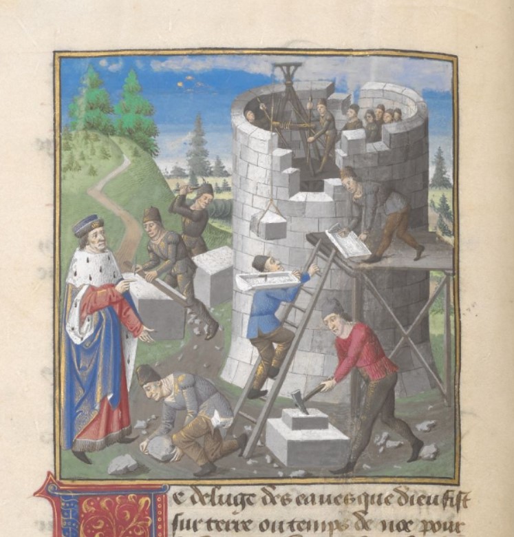 Londra, British Library, Add. 35321, f. 4v. Nembrot ordina la costruzione della Torre di Babele e osserva il lavoro dei muratori.