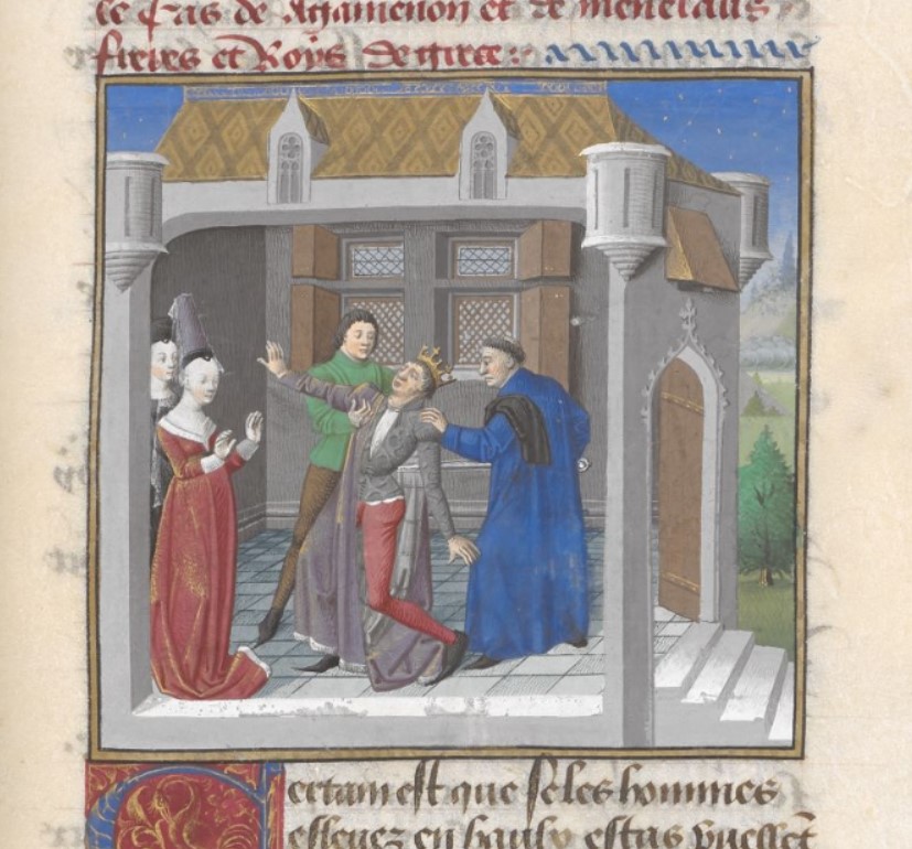 Londra, British Library, Add. 35321, f. 25r. Egisto pugnala Agamennone alle spalle mentre Clitennestra e una sua ancella assistono alla scena.