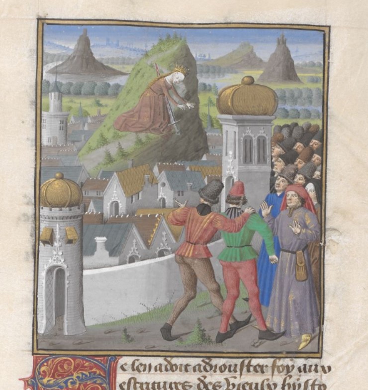 Londra, British Library, Add. 35321, f. 43r. Il popolo cartaginese assiste al suicidio di Didone.