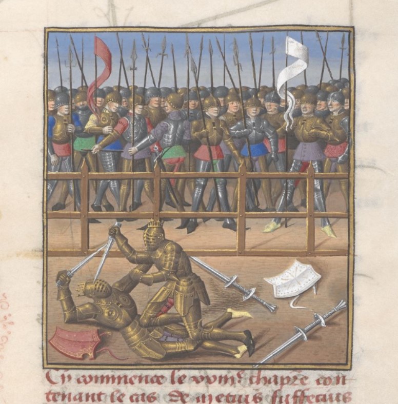 Londra, British Library, Add. 35321, f. 64r. Mezio Fufezio sconfigge Tullo Ostilio, mentre i rispettivi eserciti osservano lo scontro.