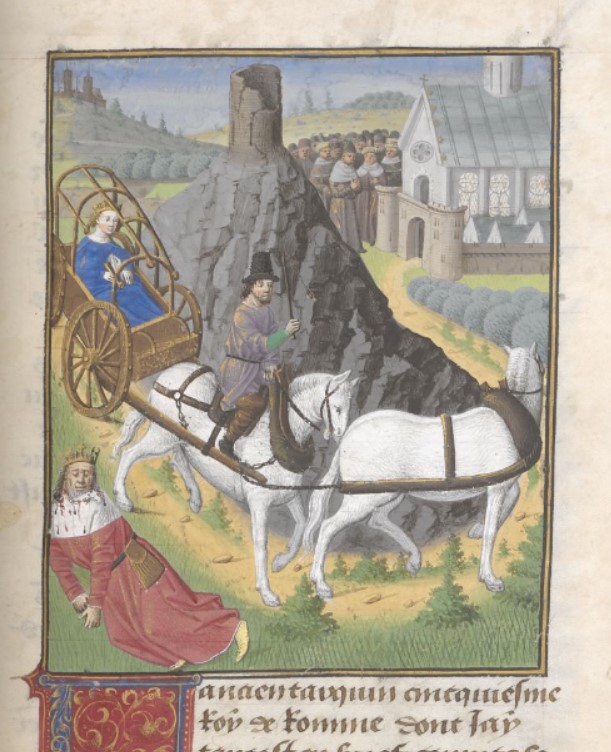 Londra, British Library, Add. 35321, f. 72r. Tullia Minore, dirigendosi verso Roma, passa con il cocchio sopra il corpo del padre Servio Tullio.