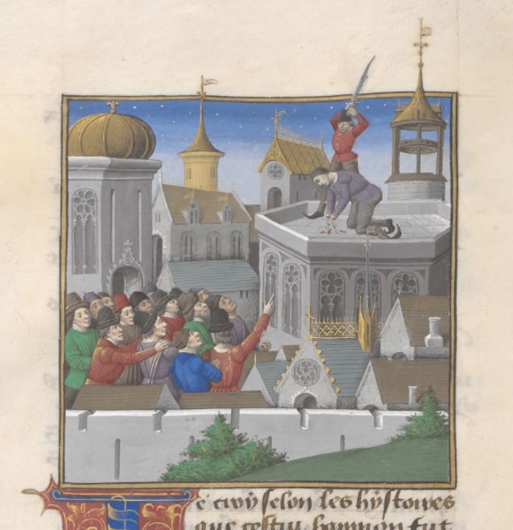 Londra, British Library, Add. 35321, f. 100r. Annone, con le mani mozzate, viene giustiziato dinanzi alla folla.