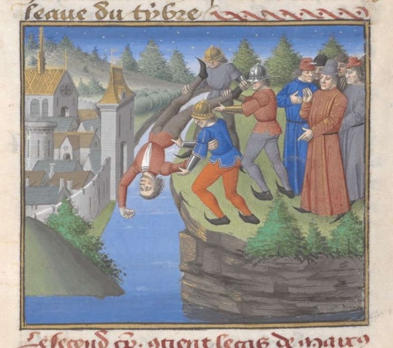 Londra, British Library, Add. 35321, f. 108r. Marco Manlio Capitolino viene gettato dalla rupe Tarpea.