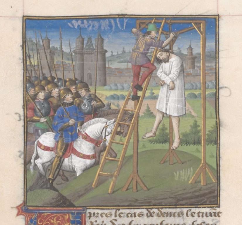Londra, British Library, Add. 35321, f. 114v. Policrate, tiranno di Samo, viene impiccato.