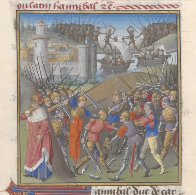 Londra, British Library, Add. 35321, f. 163v. Annibale beve il veleno da una coppa mentre il suo esercito affronta i soldati di Prusia; gli ambasciatori romani (?) si avvicinano su due navi.