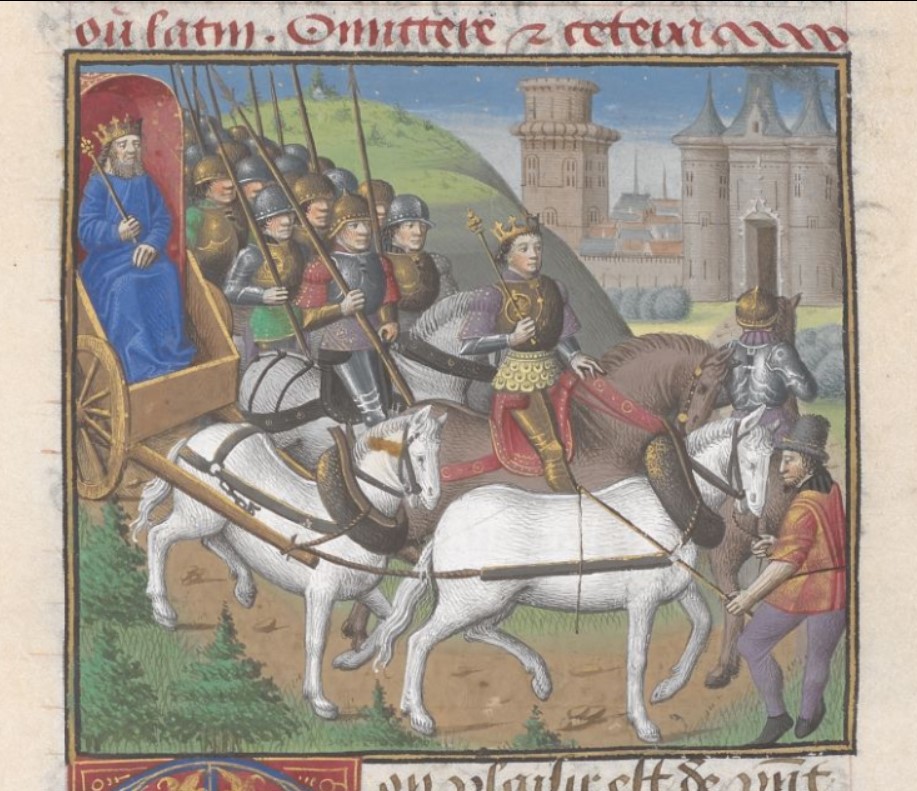 Londra, British Library, Add. 35321, f. 167r. Lucio Emilio Paolo esibisce su un carro il re Perseo durante il suo trionfo.