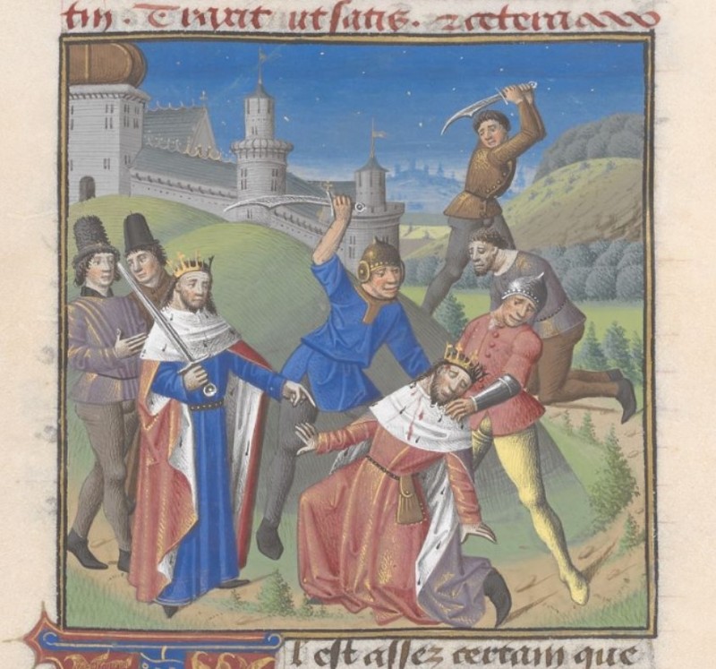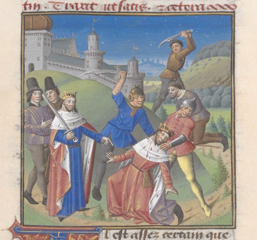 Londra, British Library, Add. 35321, f. 177v. Giugurta ordina ai suoi soldati di assassinare i fratelli Iempsale e Aderbale.