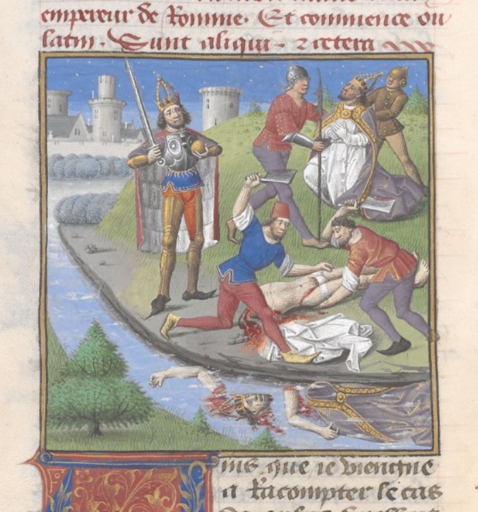 Londra, British Library, Add. 35321, f. 237v. Vespasiano ordina l'assassinio di Vitellio; sulla riva del Tevere due uomini fanno a pezzi il cadavere di Vitellio.