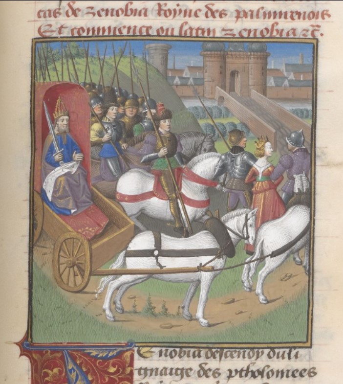 Londra, British Library, Add. 35321, f. 256r. Zenobia prigioniera precede il carro trionfale di Aureliano.