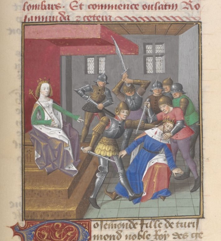 Londra, British Library, Add. 35321, f. 281r. Rosmunda, seduta sul trono, ordina ai suoi soldati di uccidere Alboino.
