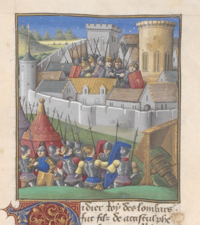 Londra, British Library, Add. 35321, f. 294r. Carlo Magno con il suo esercito assedia la città di Pavia, difesa da Desiderio con i suoi soldati.