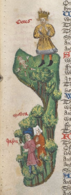 Londra, British Library, Harley 1766, f. 31v. Eete scopre il corpo smembrato del figlio Apsirto, lasciato indietro da Giasone e Medea che si danno alla fuga.