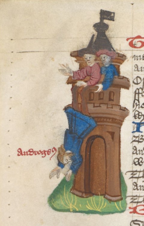 Miniatore inglese (1460 c.), Due uomini gettano Androgeo giù da una torre