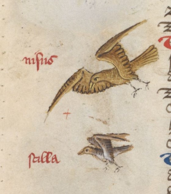 Londra, British Library, Harley 1766, f. 36v. Niso e Scilla trasformati rispettivamente in un'aquila e un airone.