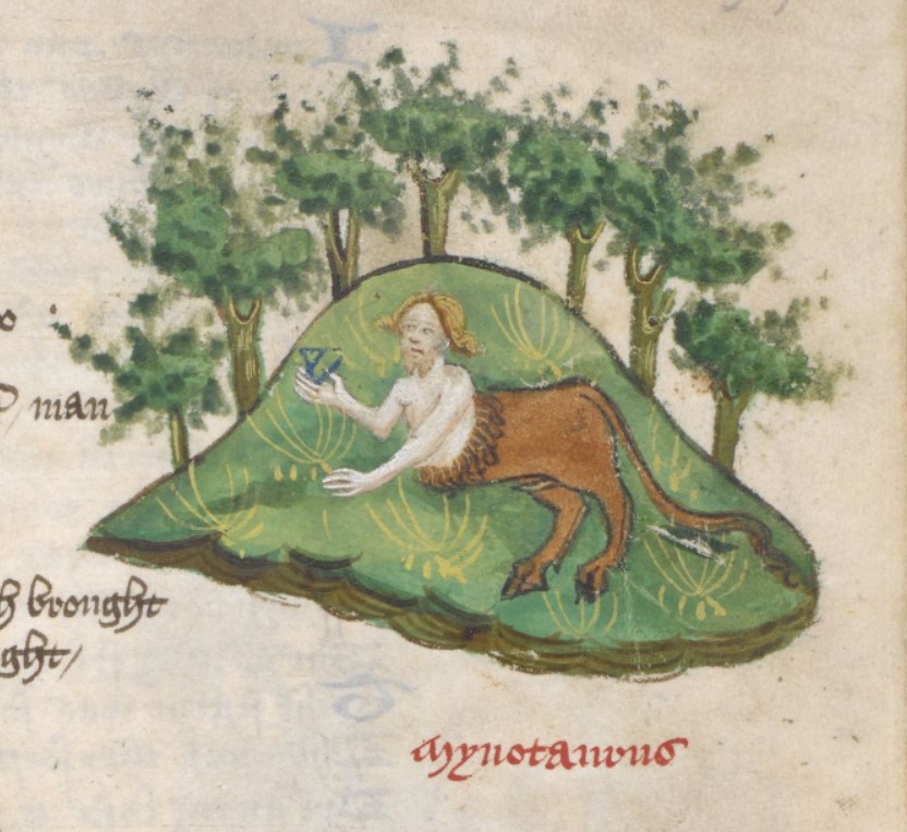 Londra, British Library, Harley 1766, f. 37r. Il minotauro, metà uomo e metà toro.