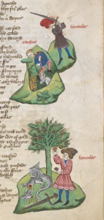 Londra, British Library, Harley 1766, f. 69r. Ercole decapita Caco per aver rubato parte dei buoi di Gerione; Ercole, dopo aver decapitato il drago Ladone a guardia del giardino, ruba i pomi d'oro delle Esperidi.