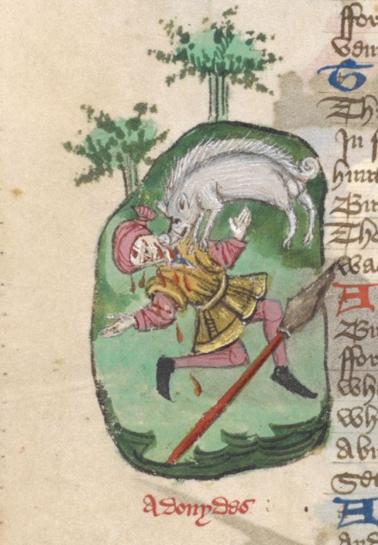 Londra, British Library, Harley 1766, f. 75v. Adone viene sbranato da un cinghiale durante una battuta di caccia.