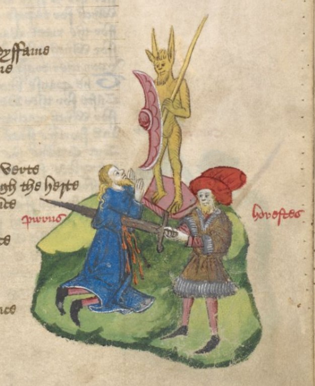 Londra, British Library, Harley 1766, f. 88r. Oreste uccide Neottolemo mentre questi è inginocchiato dinanzi alla statua di una divinità.