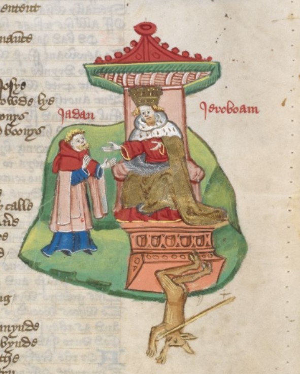 Londra, British Library, Harley 1766, f. 107r. Il profeta Jadan, giunto presso il trono di Geroboamo, predice al sovrano la rovina del suo regno; in seguito alle parole del profeta un idolo d'oro viene distrutto.