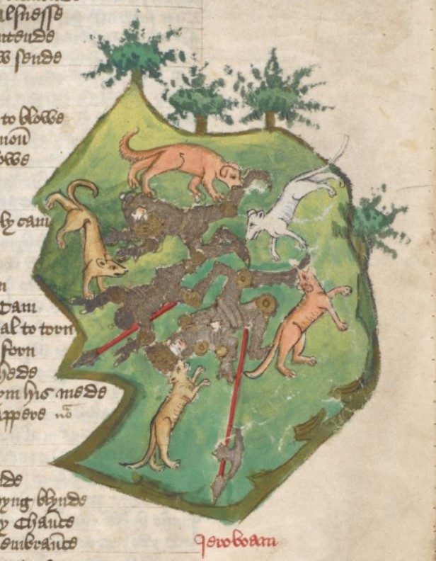 Londra, British Library, Harley 1766, f. 109r. Geroboamo e due cavalieri vengono sbranati dai cani.