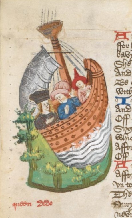 Londra, British Library, Harley 1766, f. 112v. La nave su cui viaggia la regina Didone si avvicina alla terraferma.