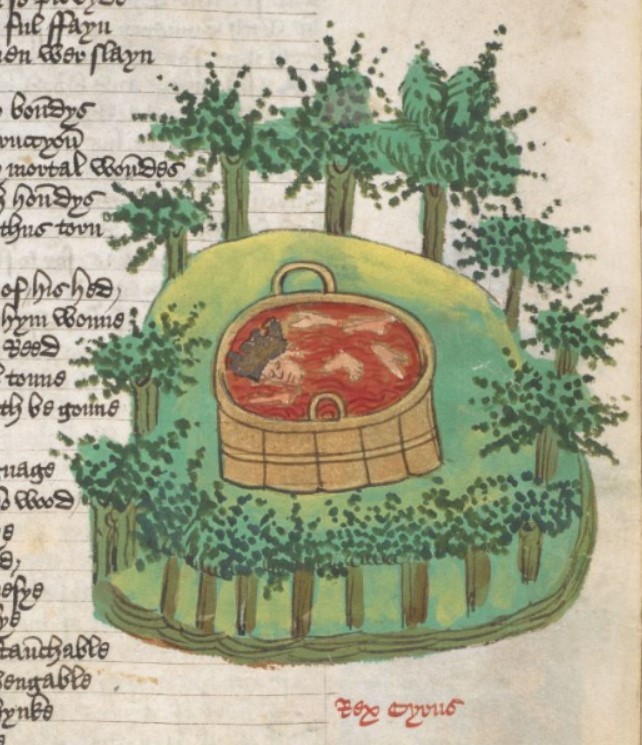 Londra, British Library, Harley 1766, f. 135r. Il corpo smembrato di Ciro galleggia in una tinozza piena di sangue.