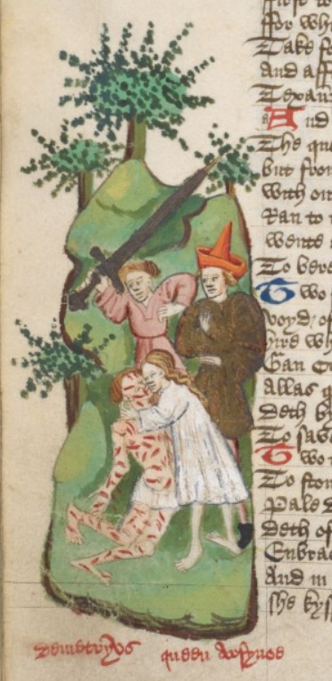 Londra, British Library, Harley 1766, f. 150v. Arsinoe stringe tra le braccia il corpo martoriato di Demetrio, dinanzi ai due assassini armati.