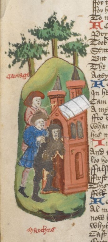 Londra, British Library, Harley 1766, f. 157v. Attilio Regolo viene preso in ostaggio e condotto a Cartagine.
