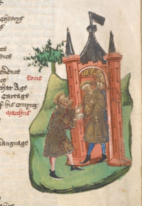 Londra, British Library, Harley 1766, f. 158r. Attilio Regolo viene accolto a Roma.