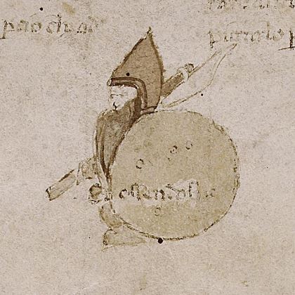 Berlino, Staatsbibliothek – Preußischer Kulturbesitz, Hamilton 90, f. 63v. Manoscritto autografo di Giovanni Boccaccio. Busto di uomo d'arme, in corrispondenza del richiamo "Et essendosi".