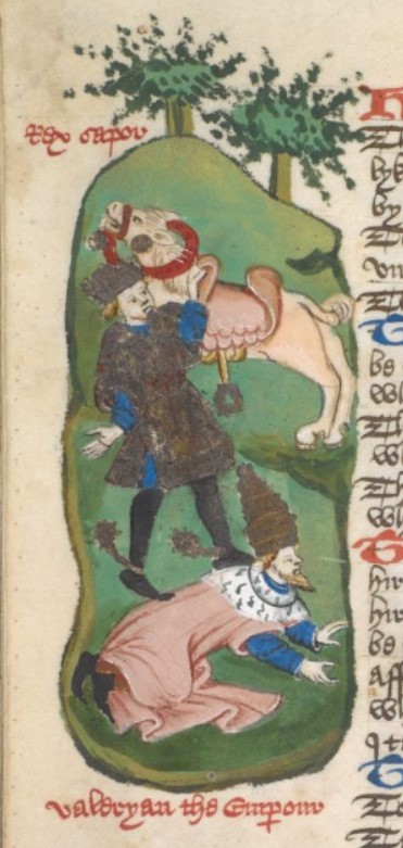 Londra, British Library, Harley 1766, f. 187v. Re Sapore monta a cavallo usando la schiena di Valeriano come predellino.