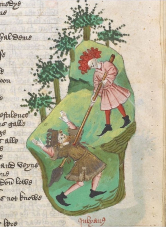 Londra, British Library, Harley 1766, f. 201r. Giuliano l'Apostata viene ucciso da un uomo con la lancia.