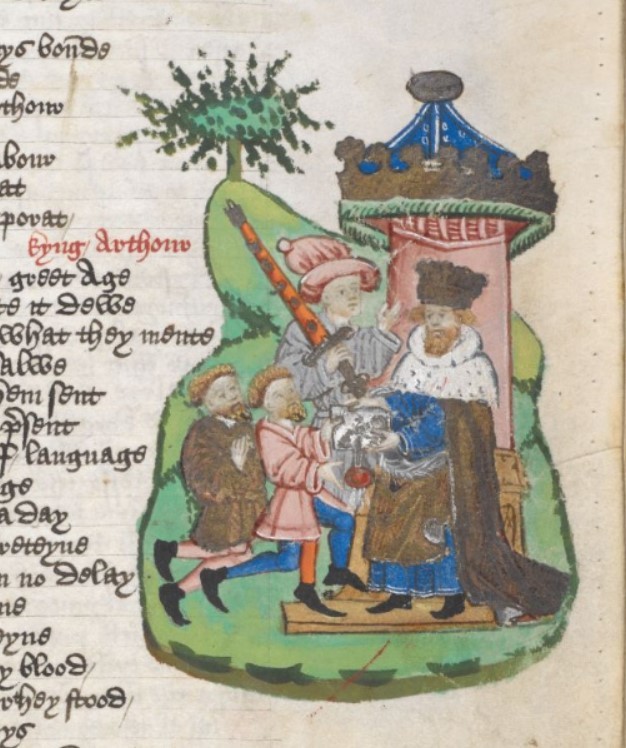 Londra, British Library, Harley 1766, f. 217r. Re Artù, seduto sul trono, riceve una lettera da due messi romani.