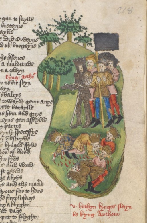 Londra, British Library, Harley 1766, f. 218r. Re Artù e tre cavalieri uccidono i re pagani.