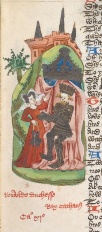 Miniatore inglese (1460 c.), Romilda consegna le chiavi della città al re degli Avari