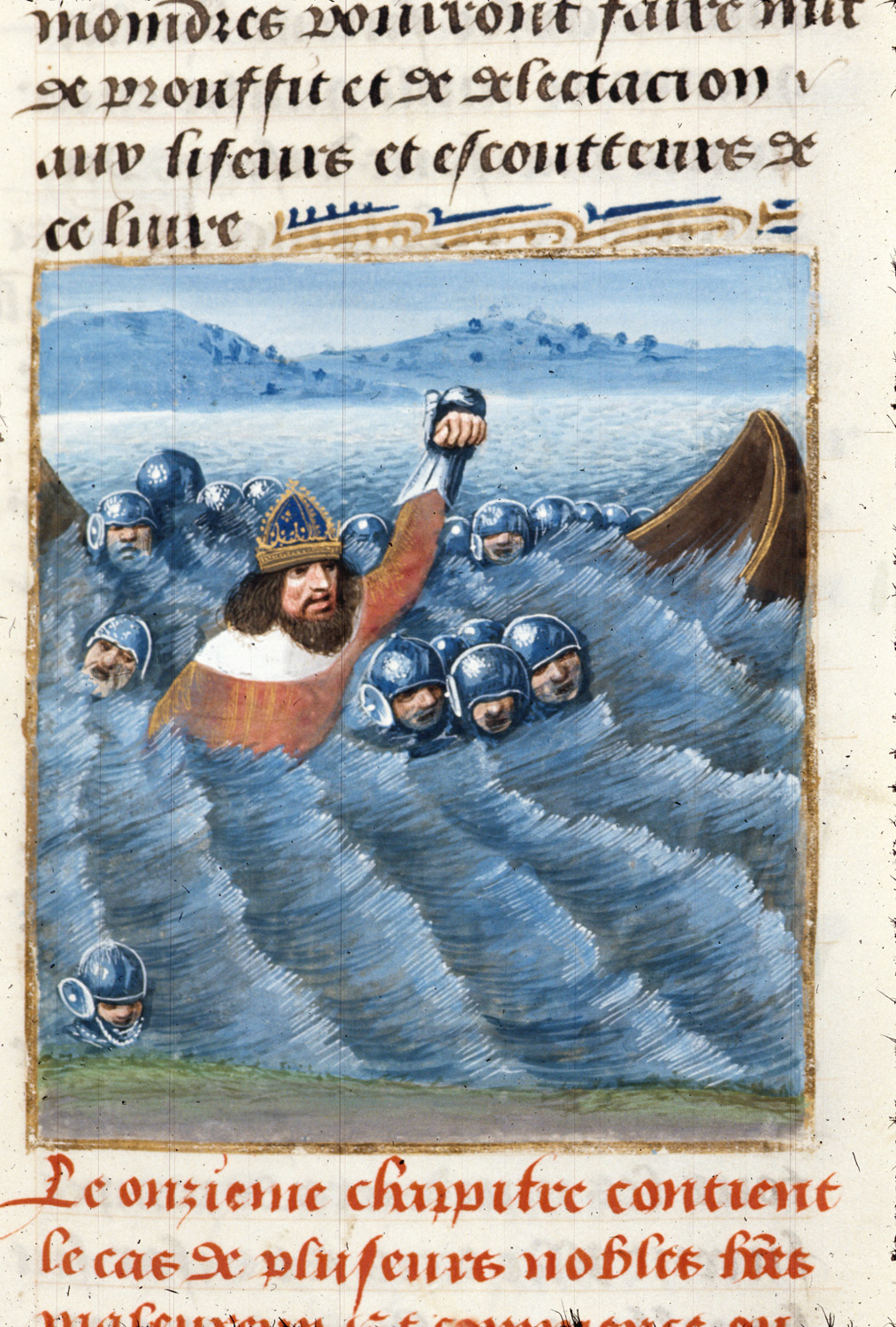 Londra, British Library, Royal 14 E V, f. 329r. La nave di Tolomeo naufraga ed il re annega insieme ai suoi soldati.
