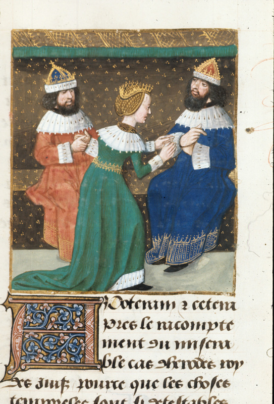 Londra, British Library, Royal 14 E V, f. 357r. Gli imperatori Tiberio e Caligola ricevono una dama incoronata (Messalina?).