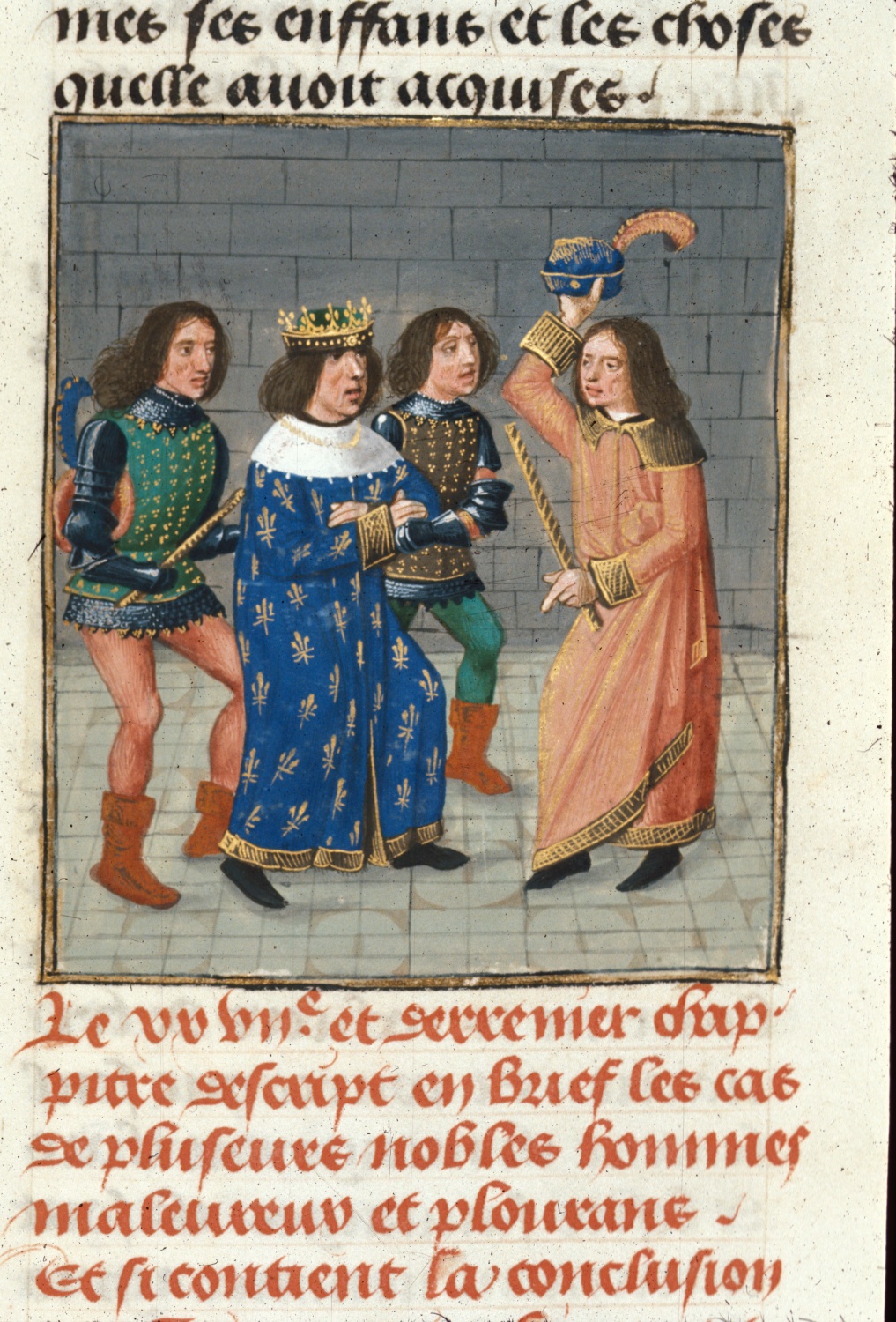 Londra, British Library, Royal 14 E V, f. 510r. Re Giovanni di Francia viene condotto in prigione, dove un uomo lo accoglie con rispetto.