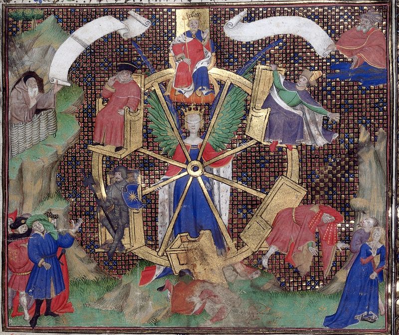 Londra, British Library, Royal 20 C IV, f. 1r. La Fortuna, rappresentata come una regina alata e bendata, gira la ruota che determina le sorti di re, nobili e guerrieri; ai margini alcuni uomini e donne osservano la scena intimoriti, mentre in alto due personaggi barbuti non identificati sorreggono due cartigli vuoti.