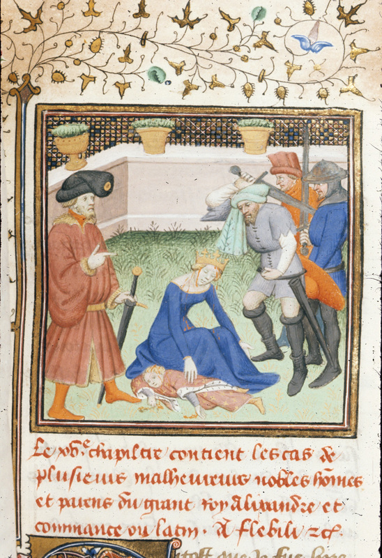 Londra, British Library, Royal 20 C IV, f. 145r. Barsine viene assassinata mentre piange la morte del figlio Eracle.