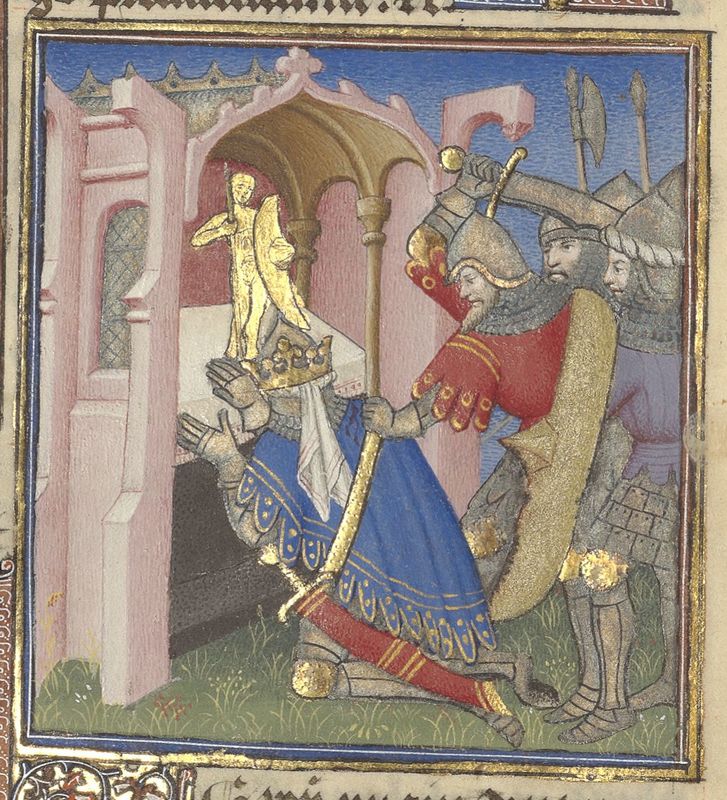 Parigi, Bibliothèque de l'Arsenal, 5193, f. 33v. Neottolemo (Pirro) uccide re Priamo mentre questi è inginocchiato in preghiera dinanzi a un altare.