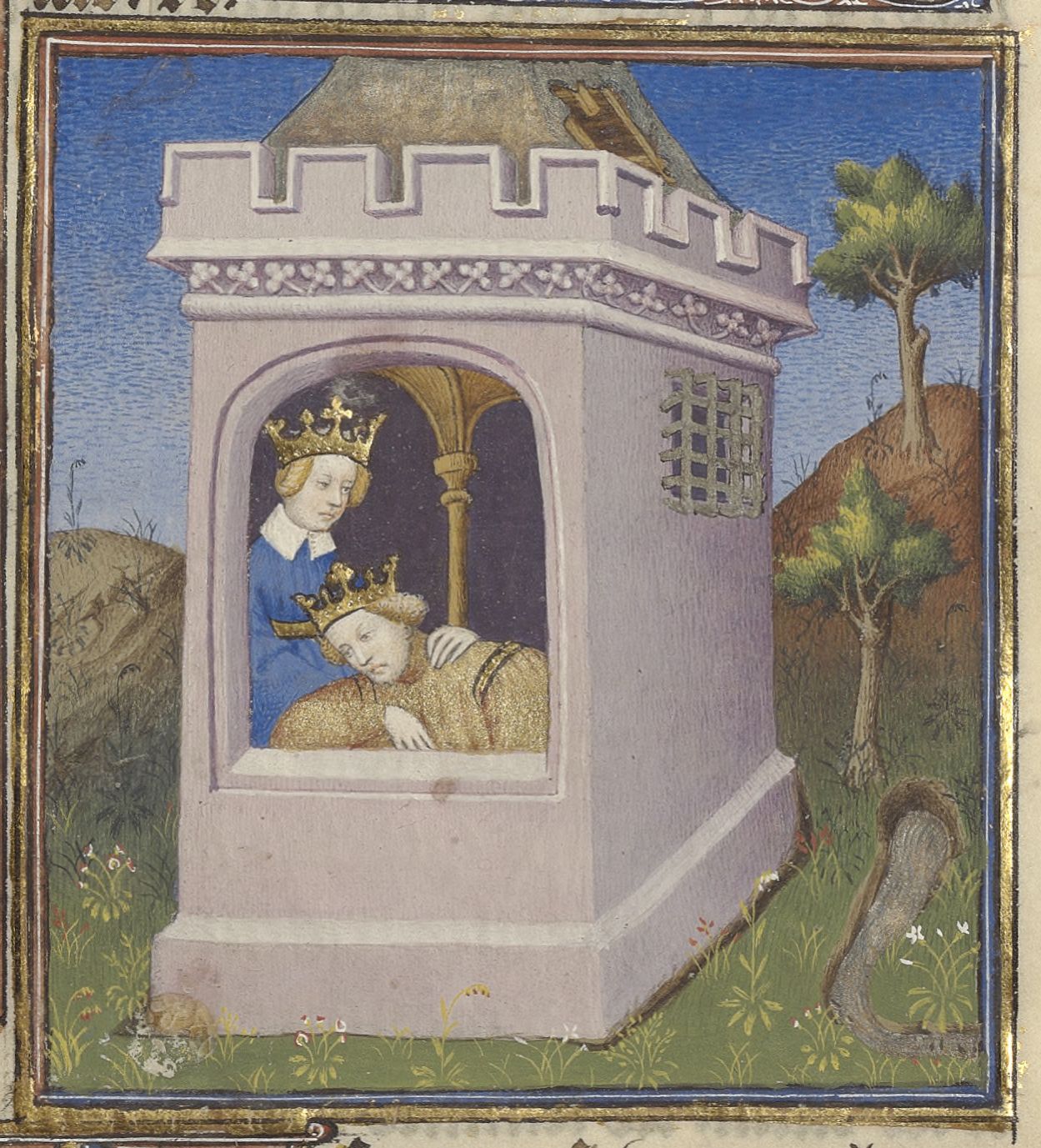 Parigi, Bibliothèque de l'Arsenal, 5193, f. 43r. Due personaggi sono rinchiusi in una prigione (?): una regina offre conforto ad un re.