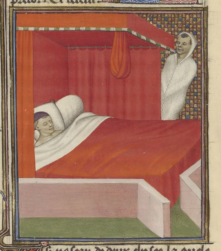 Parigi, Bibliothèque de l'Arsenal, 5193, f. 76v. Un cadavere avvolto in un sudario appare in sogno a Simonide.