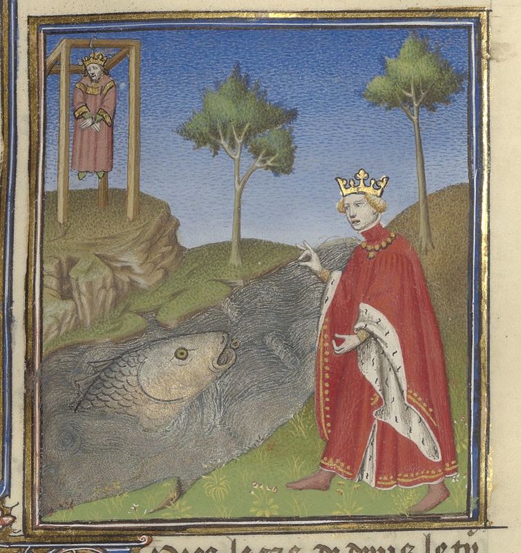 Parigi, Bibliothèque de l'Arsenal, 5193, f. 144r. Policrate, tiranno di Samo, getta in mare un anello d'oro, che viene inghiottito da un enorme pesce; Policrate viene impiccato.