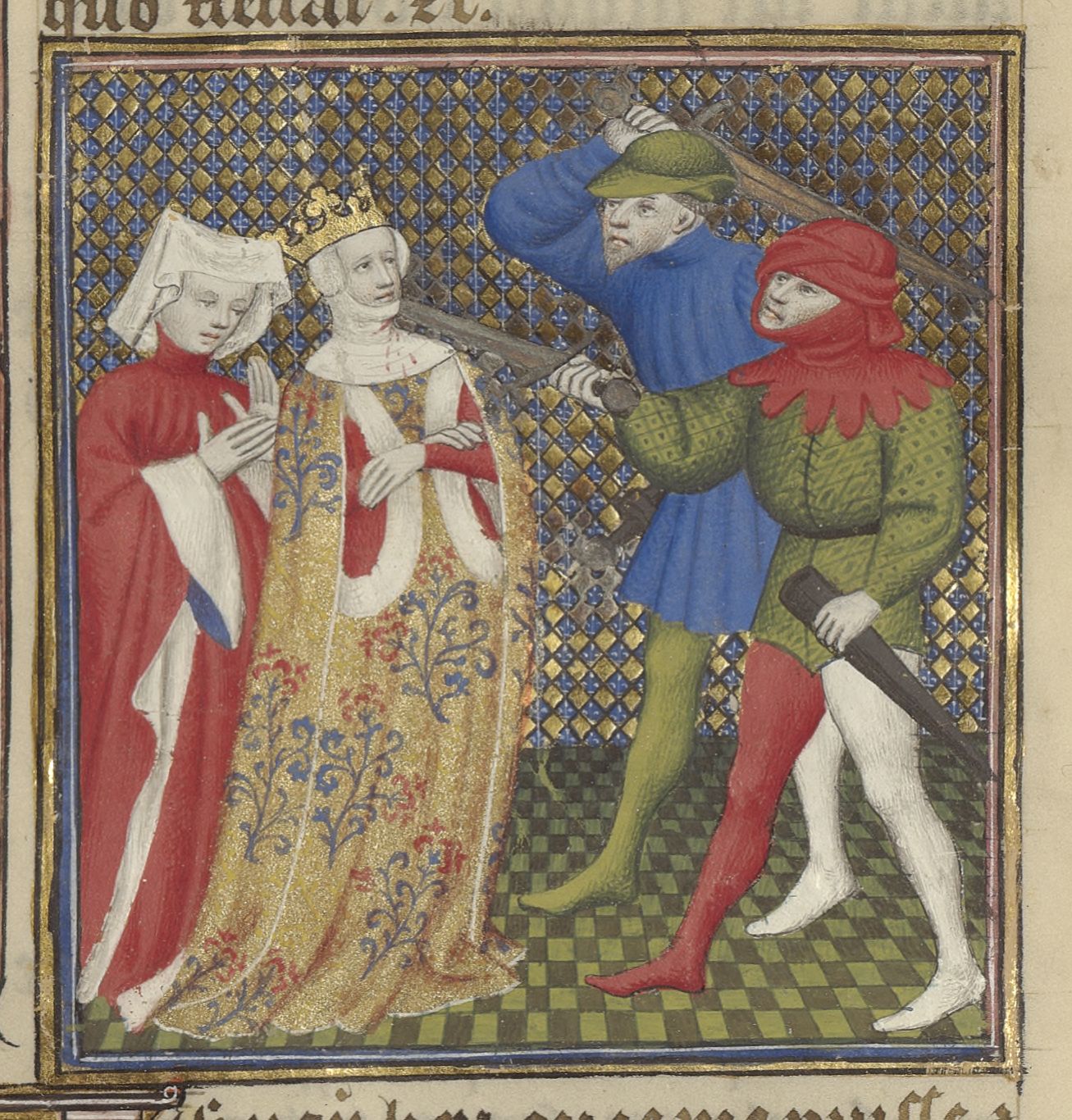 Parigi, Bibliothèque de l'Arsenal, 5193, f. 159r. Due uomini assassinano Olimpiade, madre di Alessandro Magno.