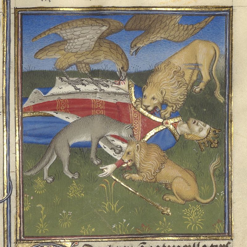 Parigi, Bibliothèque de l'Arsenal, 5193, f. 247r. Il corpo di Eucratide, re dei Battriani, viene divorato dalle belve.