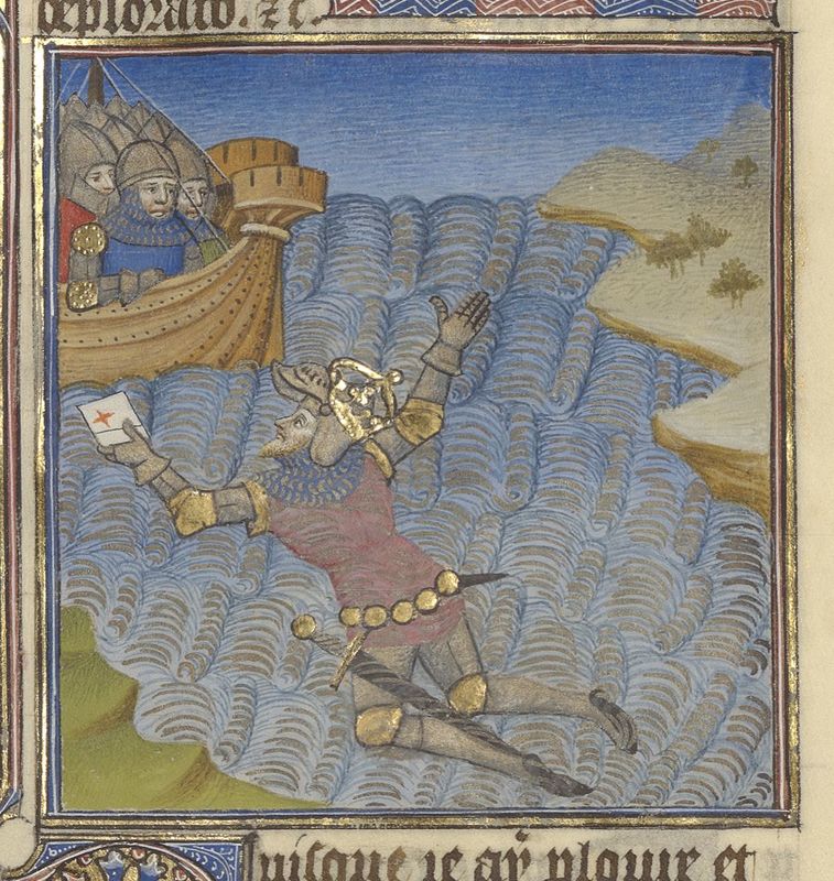 Parigi, Bibliothèque de l'Arsenal, 5193, f. 260r. Durante la battaglia di Faro, Cesare fugge a nuoto con una lettera in mano.