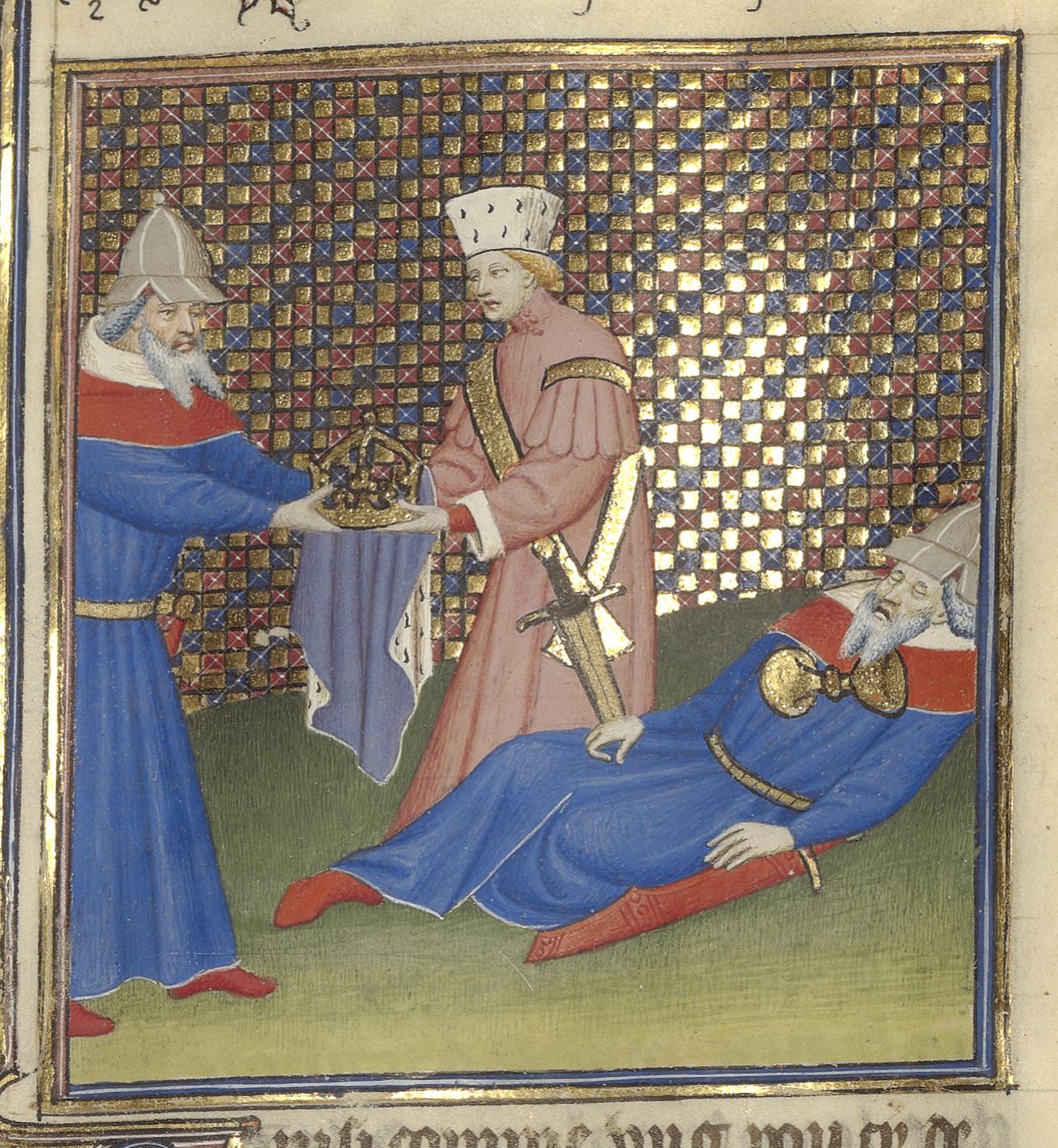 Parigi, Bibliothèque de l'Arsenal, 5193, f. 325r. L'imperatore Diocleziano abdica in favore di Costanzo Cloro; Diocleziano muore avvelenato.